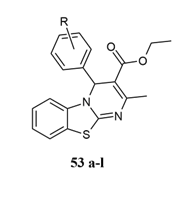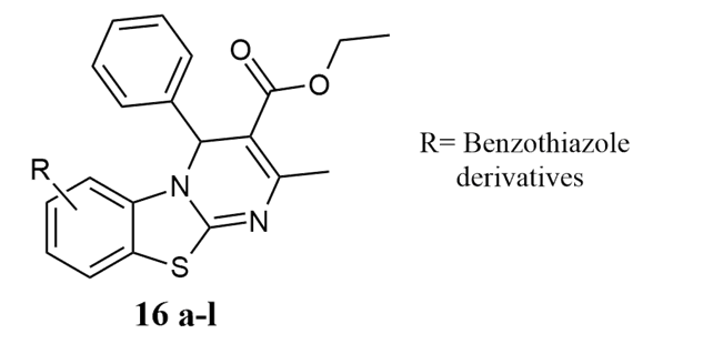 Bhoi et al. produced the 4H-pyrimido[2,1-b]benzothiazole derivative of new ethyl-2-methyl-4-(pyridine-2-yl)-4H-benzo[4,5]thiazolo[3,2-a]pyrimidine-3-carboxylate derivatives 16 a-l. A one-pot, three-component microwave-aided synthesis was used to test its antibacterial, antioxidant, and antitubercular activities against Mycobacterium tuberculosis H37RV, in which the antibacterial activity in these bacteria E.aerogens, E.coli, M.luteus and B.cereus against the Streptomycin as a standard which having 24 mm zone of inhibition in which same compounds are more or less activity compared to standard within 17 to 30 mm 12.