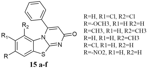Kumar et al. generated 4-Phenyl-2H-pyrimido[2,1-b]benzothiazole-2-ones. The antimicrobial activities of compounds 15a-f were investigated against a variety of microorganisms, including gram-positive or negative B.coagulans, B.substilis, P.aeruginosa, and S.aureus, using the disk diffusion method in the 1.3-15.6 mm zone of inhibition against the standard of Chloramphenicol (100 µg/ml) with a significance value of 12.3 mm 11.
