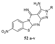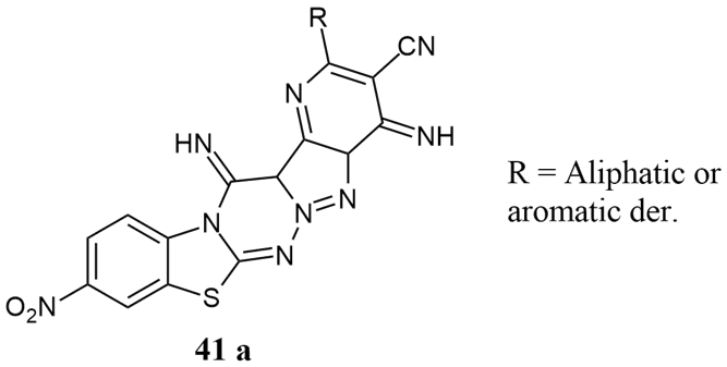 Chidrawar et al. had synthesised simple, efficient method for 2-substituted derivatives of 3-cyano-4,14-diimino-2-methylthio-10-nitropyrimido[2,3-b]pyrazolo[3,4-e]pyrimido[2,3b][1,3]-benzothiazole 41 a by one step multicomponent reaction by heating of 3-amino-4-imino-8-nitro-2H-pyrazolo[3,4-e]pyrimido[2,3-b][1,3]benzothiazole and bis (methylthio) methylene malononitrile independently with aromatic amines/phenols/heterylamines/compounds containing active methylene group respectively in the presence of dimethyl formamide and catalytic amount of anhydrous potassium carbonate. All the derivatives are screened for antifungal activity by microbial assay method against Fluconazole as a standard, 23 and 21 mm zone of inhibition for Penicillium sp. and Aspergillus niger species in the range of 7 to 23 mm 36.