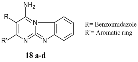 Sayed et al. synthesized pyrimido[2,1-b]benzothiazole 18 a-d with an active methylene group using selected N-, O-, and C- nucleophiles and tested its antimicrobial effectiveness against active antibacterial agents with more than 12 mm of zone of inhibition against Streptomycin and Ampicillin as a standard for S.aureus, B.subtilis, P.aeruginosa, and E.coli, bacteria in a range of less than 6 mm to more than 12mm 13.