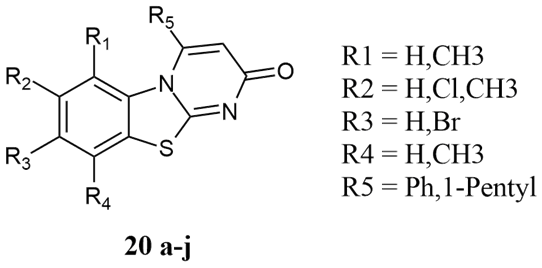 The condensed benzothiazoles 1, pyrimido[2,1-b]benzothiazoles have a considerable place in the research area, especially in synthetic as well as in pharmaceutical chemistry, because of their potent and significant pharmacological activities. Literature surveys revealed that pyrimido[2,1-b]benzothiazoles exhibit a wide spectrum of biological and pharmacological properties, such as antitumor 2, antiviral 3, anti-fungal 4, antiproliferative 5, antimicrobial 6, anti-inflammatory 7, muscle relaxant, sedative, and anti-allergic activities 8. Considering all the above findings, with potent activity. The review emphasizes the pyrimido[2,1-b]benzothiazole derivatives along with their biological and medicinal activities.