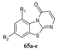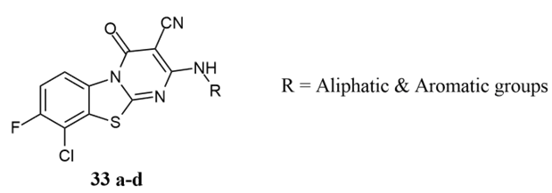Prasad et al. synthesised remarkable inhibitory effects of 9-chloro-3-cyano-8-fluoro-2-metylthio-4-oxo-4H-pyrimido[2,1-b][1,3]benzothiazole and its 2-sustituted derivatives 33a-d which had been prepared by the reaction of 2-amino-7-chloro-6-fluro-benzothiazole with ethyl-2-cyano-3,3-bismethylthioacrylate for their in-vitro anticancer activity against Doxorubicin standard within range of value inactive to 200 µg/ml IC50 for MCF-7 (Breast cancer), HeLa (Epithelial cervix cancer), A549 (lung cancer), B16 (Mouse melanoma) and Hepg2 (liver cancer) respectively 28.