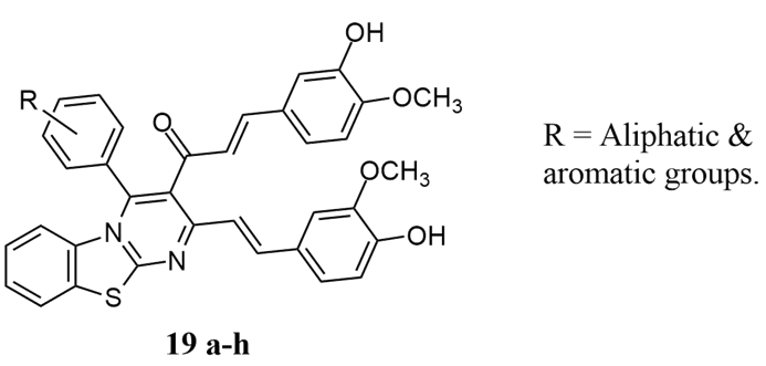 Sahu et al. synthesised 4H-pyrimido-[2,1-b]benzothiazole derivatives of curcumin 19a-h in the microwave with good yield and showed antibacterial effectiveness against ciprofloxacin as a standard with a range of 0.6 to 1.25 µM/mL Minimum inhibitory concentration (MIC) for S.aureus, S.typhi, P.aeruginosa, E.coli, B.cereus and P. rettgeri bacteria in the range of 0.625 to 20 µM/mL 14.