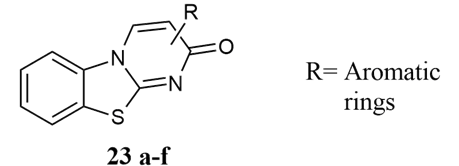 Bondock et al. reported that novel polyheterocyclic ring complexes derived from 2-oxo-2H-pyrimido[2,1-b]benzothiazole-3-carbonitrile 23a-f, were tested for antibacterial activity against Streptomycin, Chloramphenicol as a standard 6.25 µg/mL Minimum inhibitory concentration (MIC) and around 38 mm of zone of inhibition for B. subtilis, S. pyogenes, E.coli, and P.aeruginosa with the range of 3.125 -100 µg/mL, 14 to 44 mm using the agar plate method 18.