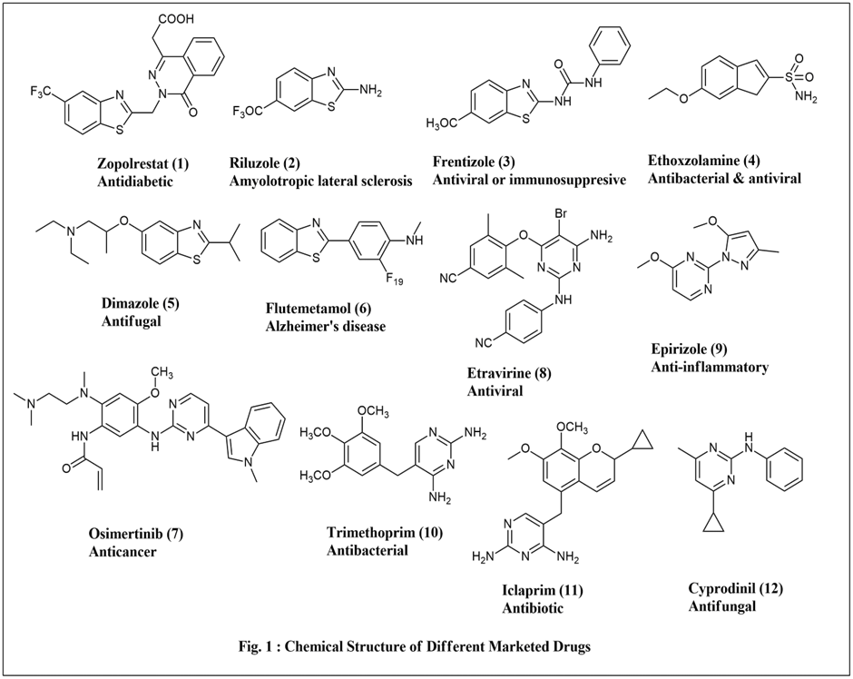 The search for promising chemical molecules for therapeutic activity is a growing trend in medicinal chemistry. Amongst the heterocyclic compounds, benzothiazole derivatives play a very important role as drugs in various diseases and disorders, and are present in various marketed drugs. The pyrimidine also plays an important role in medicinal chemistry and is present in important drug substances (Fig.1).