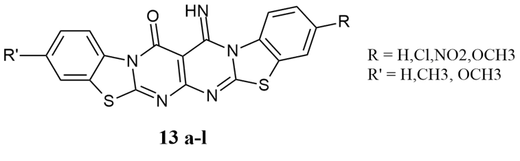 Baheti et al. developed novel 15-iminobenzothiazolo[2,3-b]pyrimido[5,6-e]pyrimido[2,3-b]benzohiazol-14(H)-one 13a-l and its 3,10-disubstituted derivatives, and reported antibacterial activity against S.aureus, B.subtilis, E.coli, and S.typhi with a zone of inhibition from 9 to 13mm, as standard drug Streptomycin and Penicillin exhibited zone of inhibition 18,22,15 and 16 mm respectively 9.