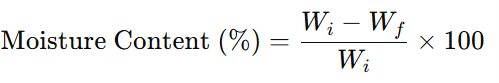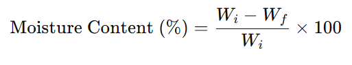 Moisture content was measured gravimetrically. Samples were dried in a hot air oven at 60?°C until constant weight. The percentage of moisture content was calculated using the formula: