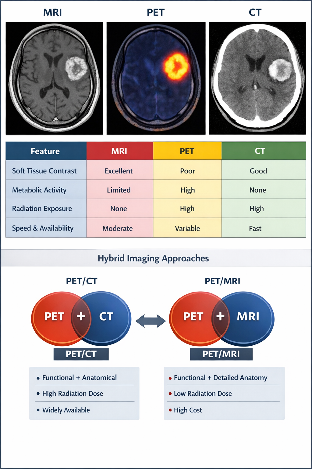 The emergence of hybrid imaging techniques, particularly PET/CT and PET/MRI, has further improved the ability to integrate structural and functional data, enabling more precise tumor characterization and treatment planning. However, challenges such as limited specificity, high costs, and lack of standardization persist and must be addressed to fully realize the potential of these technologies.