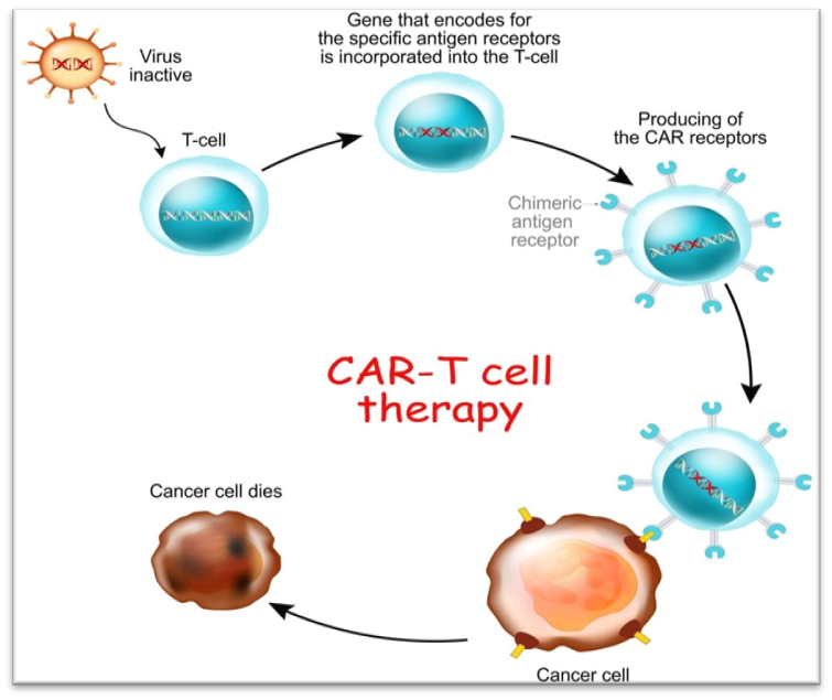 When T cells are removed from your blood, they are genetically changed in a lab by adding a special gene that creates a synthetic receptor, known as a chimeric antigen receptor (CAR).