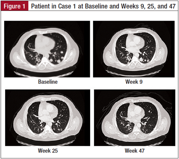The patient began on the anti–PD-L1 antibody with his first infusion in December 2013. His first scans 6 weeks after enrolling into the study indicated evidence of stable disease with minimal shrinkage of his pulmonary lesions. Subsequent scans have shown a dramatic reduction in the size and burden of his pulmonary nodules. His pleural effusion has resolved. The patient has been tolerating the therapy well with no side effects. He is continuing to receive the anti–PD-L1 antibody every 2 weeks with continued evidence of tumorshrinkage9monthsafterenrollinginthestudy.[17]