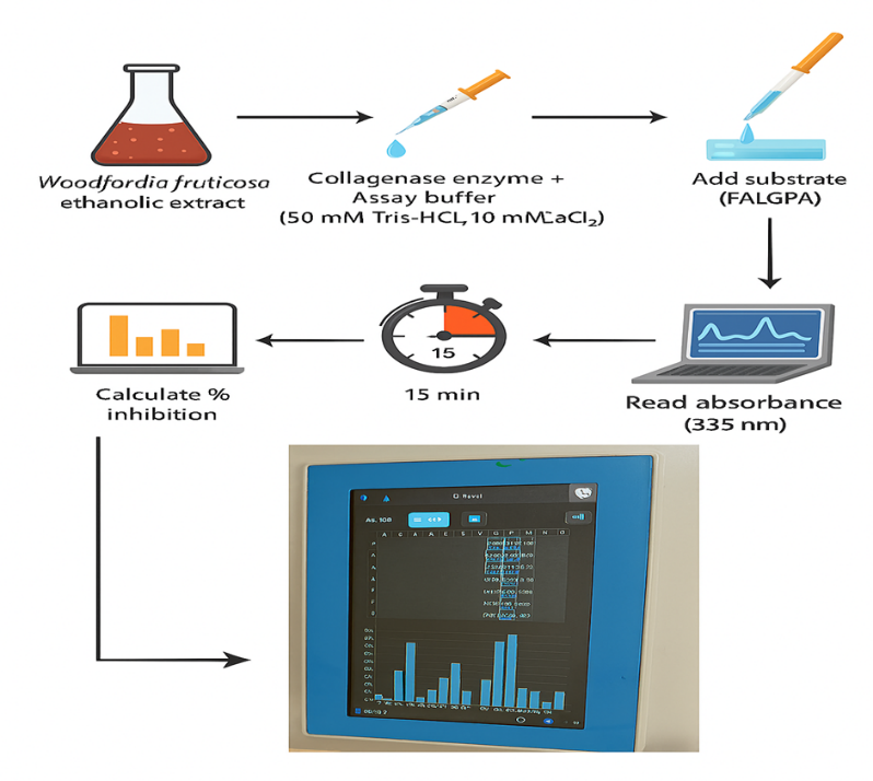 Woodfordia fruticosa, a traditional medicinal plant, has gained scientific attention for its rich polyphenolic content and emerging skin care benefits(9, 23, 28, 34). While formulation-based studies have begun exploring its applicability in topical antiwrinkle systems, rigorous biochemical validation of its enzyme inhibitory profile remains essential for evidence-based translation and comparative evaluation (2, 11, 29, 25). In particular, determining the half-maximal inhibitory concentration (IC??) against collagenase under standardized conditions not only provides a quantitative benchmark for its activity but also enables meaningful comparison with published data for both natural and synthetic inhibitors.