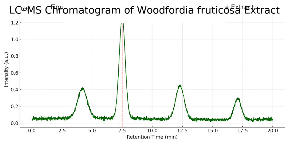 Figure 3: LC–MS chromatogram of Woodfordia fruticosa ethanol extract showing a major peak at ~7.5 minutes corresponding to vitexin (m/z 431 [M–H]?), confirming its presence as a key flavonoid constituent.