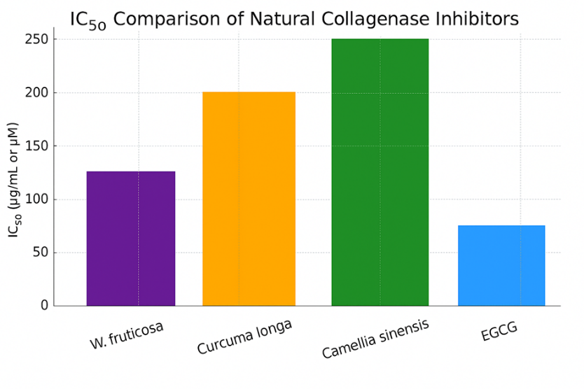 Figure 5: Comparative IC?? values of W. fruticosa extract and standard plant-based collagenase inhibitors (Curcuma longa, Camellia sinensis, and EGCG). Lower IC?? values indicate stronger inhibitory potency.
