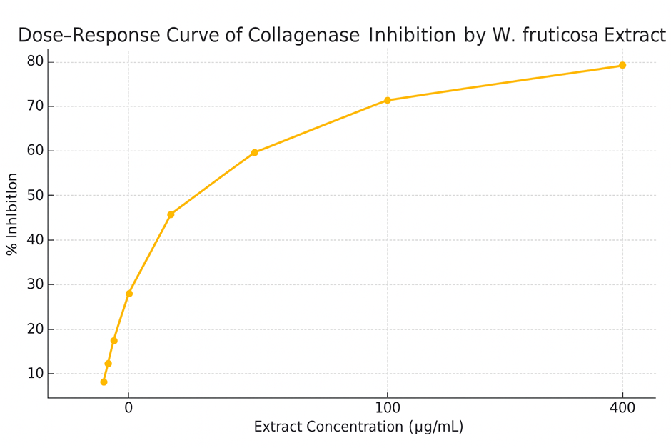 A microplate-based endpoint assay at 335 nm and 495 nm revealed dose-dependent inhibition of collagenase activity by the W. fruticosa extract. Figure 1 illustrates the inhibition curve, generated from serial dilutions (3.12–400 µg/mL of extract).