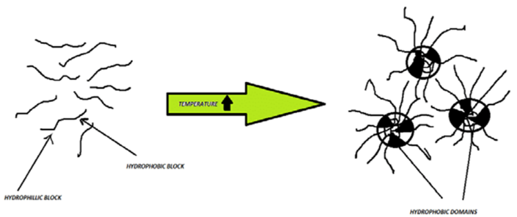 Temperature triggered in-situ gel: Temperature is the most widely used stimulus in in-situ gelling formulation for environmentally responsive polymer systems. Both in vitro and in vivo, the temperature change that is employed is simple to regulate and apply. Body warmth causes gelation in this system; external heat is not necessary. These hydrogels are liquid at normal temperature (20–25°C), but when they come into contact with bodily fluids (35–37°C), the temperature rises and causes them to gel. Three different kinds of temperature-induced systems exist. They are both positively and negatively thermosensitive, such as poly (nisopropylacrylamide) and thermally reversible polyacrylic acid. For instance, Tetronics, Plurionics, and Poloxamer. In this system, temperature-responsive or thermoresponsive polymers—which exhibit a sharp and abrupt change in their physical characteristics with temperature—are employed. There is a miscibility gap between these polymers at high and low temperatures, as well as an upper and lower critical solution temperature.(9)