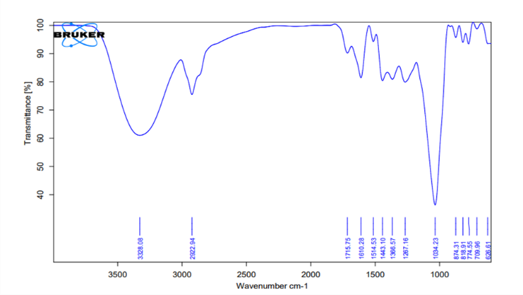 The FTIR spectral analysis of Cinnamomum tamala confirmed the presence of characteristic functional groups through their corresponding absorption peaks. The observed peaks closely matched the standard values, with minor variations attributed to instrumental factors or environmental conditions. At 2922.94 cm-1, the C-H stretching vibration was detected. At 1443.10 cm-1, the C-H bending peak was detected. The observed C-H bending was 1366.57 cm-1.