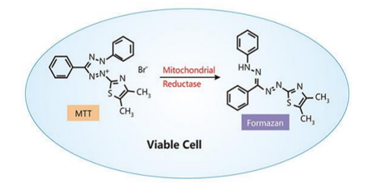 Principle of Assay: Since mitochondrial succinate dehydrogenase enzymes in living cells can change the yellow water soluble substrate 3-(4, 5-dimethylthiazol-2-yl)-2, 5-diphenyltetrazoliumbromide (MTT) into an insoluble, purple formazan product that can be measured using spectrophotometry, this colorimetric assay is based on this ability. Since MTT can only be reduced by metabolically active cells, the level of activity serves as a barometer for the viability of the cells.