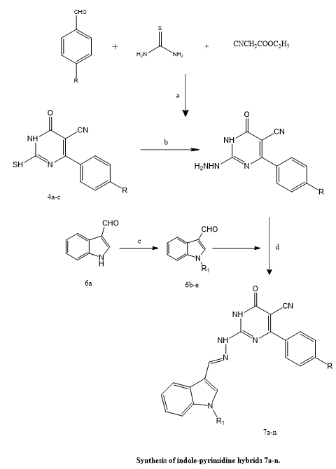 Phoebe F. et, al., created and synthesized fourteen new indole-pyrimidine hybrid compounds with the goal of targeting the anti-apoptotic protein Mcl-1, which is widely overexpressed in many malignancies. The synthesized compounds' structures were verified using spectroscopic methods. The (E)-configuration of the synthesized compounds was confirmed through a combination of computational and experimental methods, utilizing MM2 force field calculations alongside 2D NOESY NMR spectroscopy for structural validation. Initial biological evaluations indicated that several compounds—particularly 7d, 7e, 7i, and 7k—exhibited potent inhibitory activity against the anti-apoptotic protein Mcl-1, with Ki values falling within a narrow range of 11.19 to 15.21 nM. Additional profiling revealed that select molecules, such as 7i and 7d, also demonstrated dual inhibitory effects on Bcl-XL and Bcl-2 proteins, suggesting broader activity across the Bcl-2 family of apoptosis regulators. To further assess their anticancer potential, the most active compounds were subjected to in vitro cytotoxicity testing against a panel of human cancer cell lines, including PC-3 (prostate cancer), K-562 (chronic myelogenous leukemia), and MDA-MB-231 (triple-negative breast cancer). The results showed moderate to strong antiproliferative effects across these models. Computational docking studies provided further support by confirming stable binding interactions of these inhibitors within the Mcl-1 binding pocket. Additionally, in silico predictions of pharmacokinetic properties, including drug-likeness and pre-ADMET parameters, suggested that the compounds possess favorable profiles for further development as anticancer drug candidates.(23).