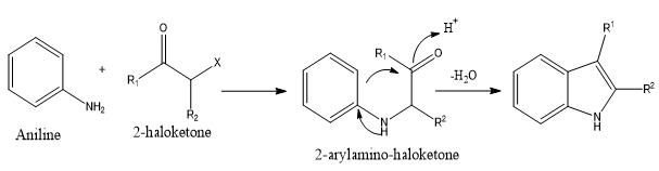 2-arylamino-ketones, which are produced using a 2-halo-ketone and an arylamine, undergo acid-mediated cyclization as the reaction progresses, closing the aromatic system's electrophilic rings. Rearrangement events throughout the reaction often result in product mixes.