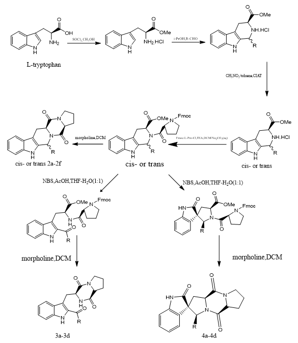 Bin Jia et, al., suggested a methodical strategy for the synthesis of diketopiperazine (DKP) alkaloids based on indole, focusing on three important analogues. 24 indole DKP derivatives were synthesized and evaluated for antibacterial activity as part of their inquiry, with an emphasis on comprehending their structure–activity correlations (SAR). Derivatives 3b and 3c of the produced compounds demonstrated strong antibacterial activity against all four tested bacterial strains. Additionally, components 4a and 4b had wide-ranging antimicrobial actions, showing effectiveness against a variety of plant pathogenic fungi in addition to their antibacterial qualities. Compound 3c's strong binding affinity for the FabH enzyme in Escherichia coli was shown by molecular docking investigations, providing information about its possible mode of action. All of these findings demonstrate the synthetic indole DKP compounds' therapeutic value and their potential as building blocks for the creation of new antibacterial drugs that specifically target FabH.(5).