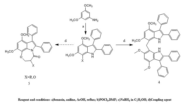 Syeda Laila Rubab et, al., the researchers conducted an in-depth study aimed at synthesizing and analyzing bis(4,6-dimethoxy-2,3-diphenyl-1H-7,7′-indolyl)methane, along with a few structurally similar indole-based compounds. Their synthetic pathway began with a modified version of the Bischler indole synthesis to produce an initial compound (compound 1). This compound underwent a formylation reaction to yield compound 2, which was then chemically reduced to form an alcohol intermediate (compound 3). When efforts were made to cyclize this alcohol into a fused heterocyclic structure (intended compound 5), the reaction unexpectedly gave rise to a different product—a bisindole compound identified as compound 4. The structure of this compound was thoroughly confirmed using advanced spectroscopic tools and single-crystal X-ray diffraction, ensuring accuracy in its molecular identification. Revealing a non-planar geometry with distinct dihedral angles. Hirshfeld surface analysis was employed to evaluate intermolecular interactions, showing that hydrogen-hydrogen and hydrogen-carbon contacts dominated, while enrichment ratio calculations confirmed that hydrogen-oxygen interactions played a crucial role in crystal packing. Density Functional Theory (DFT) studies provided insights into the electronic properties, including HOMO–LUMO energy gaps, chemical potential, electronegativity, and electrophilicity. Among the synthesized compounds (1–4), the bisindole derivative (4) exhibited the highest stability and most favorable electronic properties, suggesting its potential as a strong pharmacological candidate. Furthermore, both in vitro and in silico evaluations of antibacterial, antiurease, and α-amylase inhibitory activities revealed notable bioactivity, particularly for the dimerized indole, underscoring the therapeutic promise of these indole-based compounds(12).