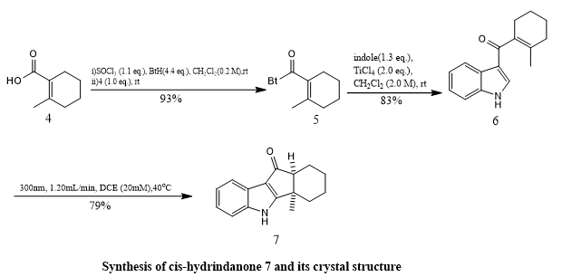 Marvin Fresia et, al., devised an innovative synthetic strategy utilizing a photo-Nazarov cyclization of a 3-acylindole precursor, initially leading to the formation of a thermodynamically stable cis-hydrindanone. This intermediate underwent reduction and was transformed into a cyclopentadiene, followed by dihydroxylation and hydrogenation steps to obtain the corresponding indoline. A key feature of the synthesis was a stereospecific hydride migration within a dioxaphospholane intermediate under Grainger's conditions—marking the first successful application of this method to an N-heterocyclic system. Starting from an indole scaffold, the researchers were able to generate previously unreported methanocyclohepta [b]indolone derivatives. To achieve deoxygenation of the trans-hydrindanone, the compound was first converted into a 1,3-dithiolane and then reduced using RANEY® Ni. The resulting trans-hydrindanone was deprotected with sodium naphthalide and further dehydrogenated using palladium on charcoal, ultimately yielding the desired trans-fused indeno[1,2-b]indole (compound 24). This product was obtained in a 2.5% overall yield across a 12-step synthetic route. Overall, the study illustrates the potential of the photo-Nazarov approach in assembling intricate indole-fused systems while effectively addressing stereochemical challenges(11).