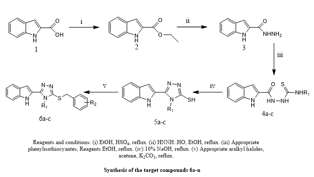 Khushbu Agrawal et, al., highlighted the growing significance of indole and its derivatives in a range of biological activities and emphasized its value in medicinal chemistry. Antitubercular, antiviral, antibacterial, and antimalarial, anti-inflammatory in nature antileishmanial, anticholinesterase, anticancer, and enzyme inhibitory qualities are a few these comprise. The WHO has identified antimicrobial resistance (AMR) as one of the top ten global health threats due to its increasing prevalence. New therapeutic medications are desperately needed. In this study, we created novel indole derivatives based on sulphonamides from 1H-indole-2-carboxylic acid. 1H NMR and LC-MS spectroscopy were used to validate the structural identity of the produced compounds. Both Gram-positive and Gram-negative bacterial strains were used to assess the antibacterial activity of these compounds. Among the investigated substances, good activity was demonstrated against Staphylococcus aureus, with particularly high inhibitory effects against Klebsiella pneumoniae, showing potential as effective antibacterial agents(8).