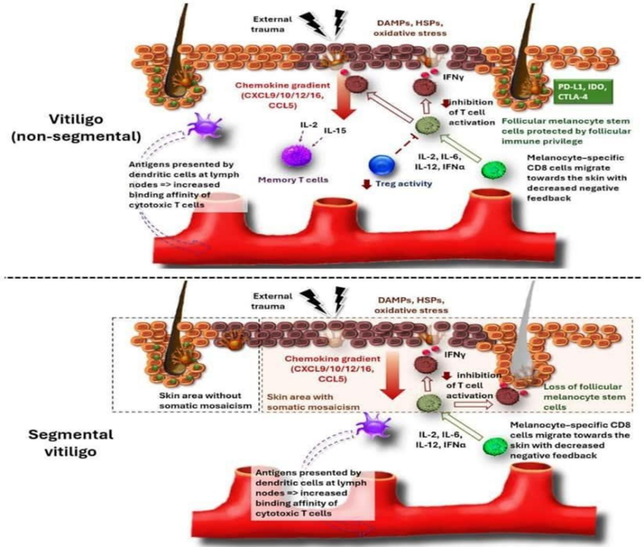Hair follicle melanocytes, with their distinctive antigenic makeup, along with dermal stem cells, are being investigated for their contributions to repigmentation and disease stabilization.Ongoing advances in understanding vitiligo’s molecular and cellular mechanisms are guiding the development of more precise and effective therapies [7].