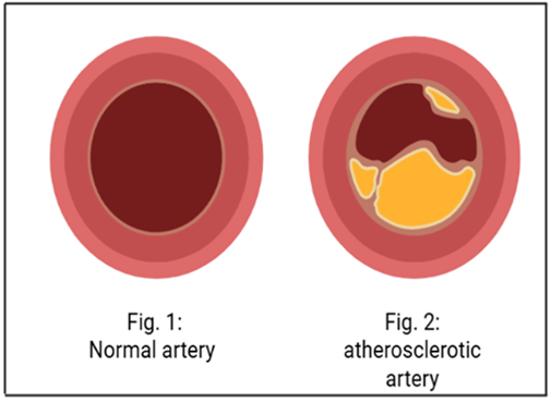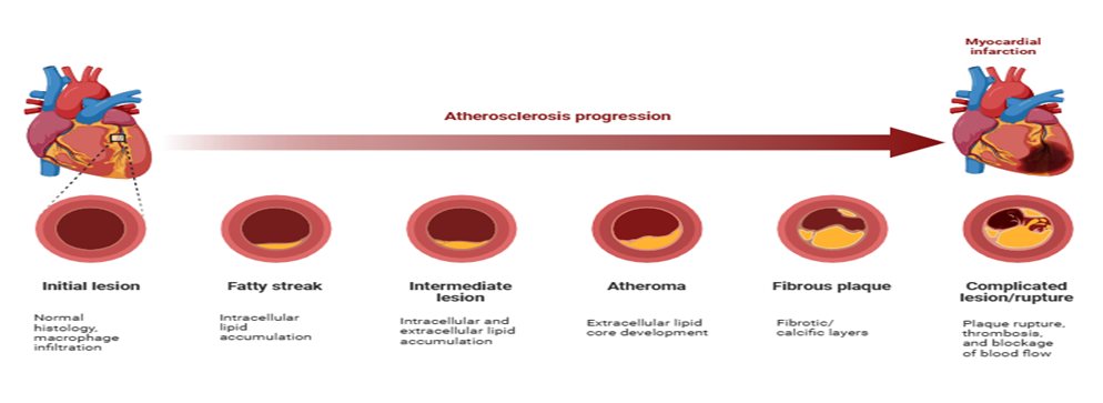 Atherosclerosis starts with the formation of fatty streaks, the primary visible lesions caused by the aggregation of cholesterol-rich LDL in the inner lining of arteries. LDL permeates the endothelium and attaches to proteoglycans, specifically heparan sulphate, which facilitates its accumulation and shows excision, leading to an escalating buildup. Monocytes immigrate into the endothelial layer, convert into macrophages, and phagocytose LDL to form foam cells, while SMCs replicate and extracellular fat deposits aggregate, generating a soft lesion. Over a period of time, the plaque dilated, at first amplifying outward but ultimately constricting the arterial lumen; once it includes more than 40% of the inner elastic layer, the vessel is regarded substantially obstructed[3]. This development sets the stage for advanced atherosclerotic disease and potential health complications such as myocardial infarction, angina or stroke.
