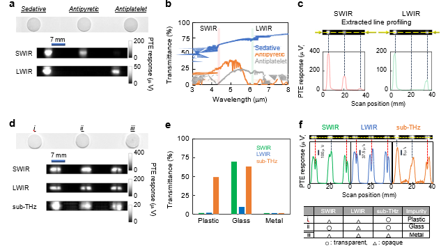 Fig 2- A carbon nanotube film-based photo-thermoelectric imager for non-destructive, ultrabroadband, multi-wavelength optical inspection of defective pharmaceutical pills. a) identification of material compositions. b) fundamental property of inspected sample. c) Transmissive line-profiling which obtained from the PTE image. d) Identification technique same but concealed foreign substance. e) fundamental property of each foreign substance. f) transmissive line-profiling which obtained from PTE image of foreign materials.