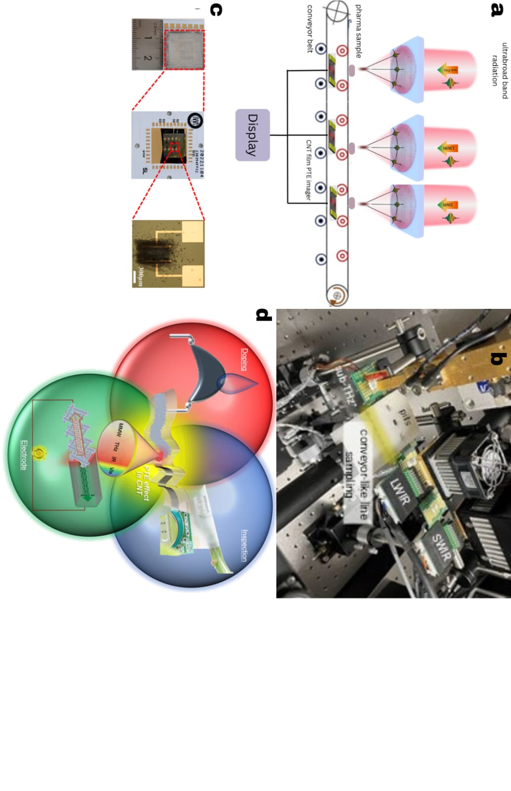 This is simple form demonstration of non-destructive in-line dynamic inspection system for pharma agent like pills with freely attachable functional CNT imager sheets and the associated ultrabroadband sub-THz–IR band photo-monitoring (Fig. 1a). the above simple demonstrated system develops in experimental setup containing with sub-THz-IR imagers and multiple photo sources which have longer wavelength extracted in single wavelength in advance (Fig. 1b). CNT detailed model which chosen as working electrode for sensing devices to their extra ordinary low detecting limit (Fig. 1c). process modeling, design master plan, and fundamental performances this all working of the PTE (Fig. 1d).