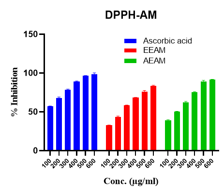 Free radical scavenging by DPPH scavenging method: Free radical scavenging activity of samples was measured using the 2,2-diphenyl-1-picrylhydrazyl (DPPH). Briefly, 1.0 ml of sample solution with different concentrations (0.1, 0.2, 0.3, 0.4, 0.5 and 0.6 mg/ml) was added to a 4 ml of 0.004% methanolic solution of DPPH.