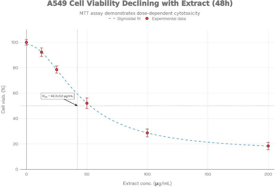 2. Crude extract complexity: The extract contains multiple phytochemical constituents. Cytotoxicity cannot be attributed to specific compounds, limiting mechanistic understanding. Individual compound isolation and testing would clarify active principles.