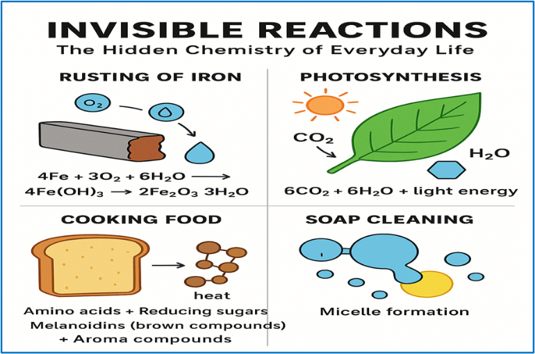 Many people think of chemistry as a field limited to labs, test tubes, and complicated equations. However, beneath the surface of our everyday activities is a massive network of unseen chemical reactions that influence technology, the environment, and our health. This chapter examines the invisible chemistry that underlies commonplace occurrences, such as food oxidation, photochemical reactions that cause textiles to lose their color, metabolic changes that support life, and the polymerization processes behind contemporary materials. This work demonstrates how invisible processes connect the tiny and macroscopic worlds by deciphering the molecular mechanics underlying common activities like cooking, cleaning, breathing, and even emotions. The chapter focuses on green and sustainable chemistry methods that reduce dangerous reactions in both home and commercial environments. "Invisible Reactions: The Hidden Chemistry of Everyday Life" encourages readers to view chemistry as an intimate, ongoing process that determines the essence of daily life rather than as a distant science through captivating examples and scientific discoveries.