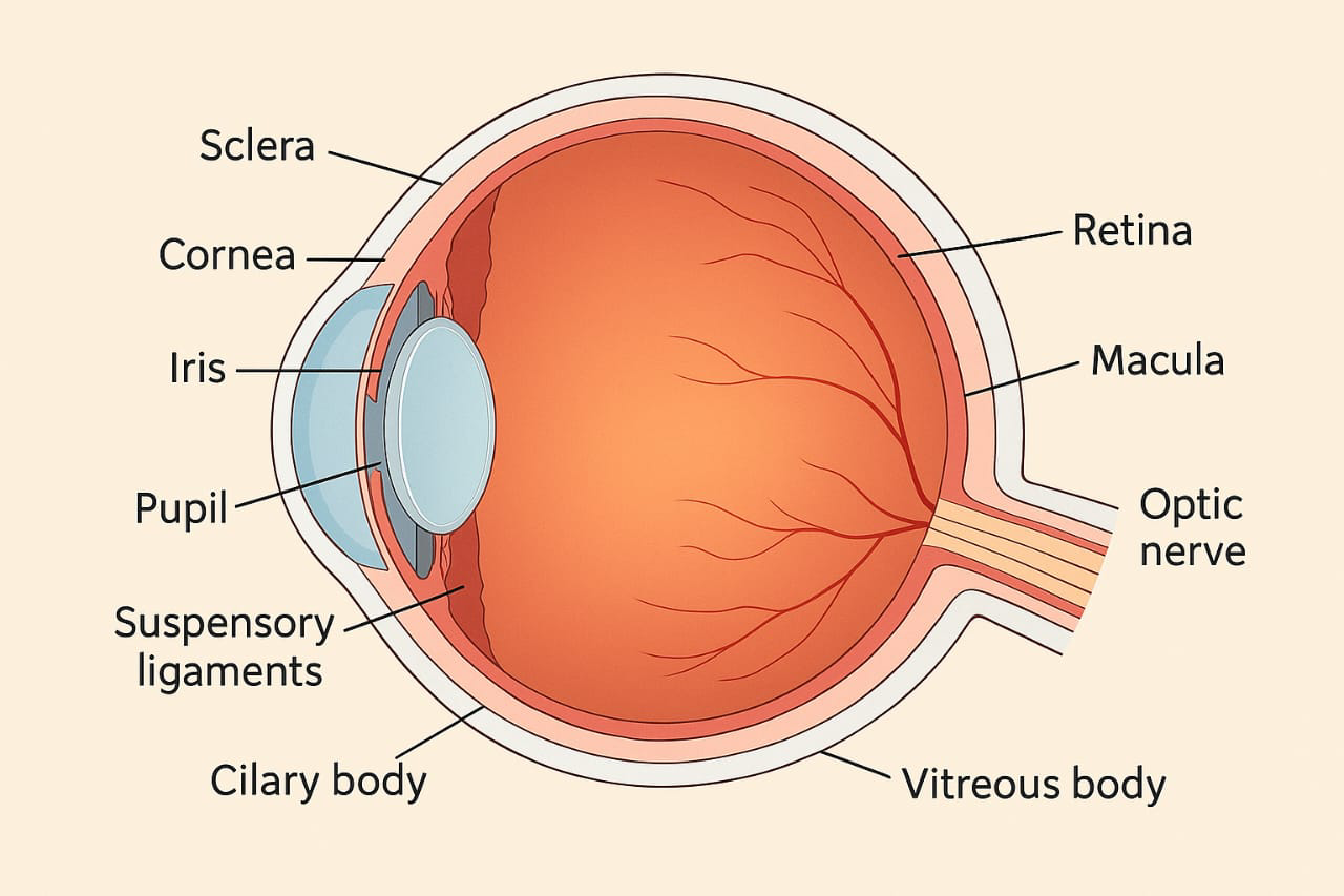 The human eye, from the anterior segment to the rear segment, is created The glass of glass, more a lens, horny, conjunctive, aquatic, iris, choroid, retina and sclera. Form of The human eye is spherical with a diameter of nearly 23 mm. it she has a complicated series of delicate mechanisms later visible parts that operate in the union to convey an image of the object seen in the brain. The extent and quality of light The entry in the eye is regulated and leaked by the student, which expand and contract as needed. In functioning The natural ingredients of the eye can be divided in three Layers: (i) the outer layer includes the clear and transparent layer White and dark sclera and scler; (ii) the intermediate layer holds Iris ahead, the returning choreoid and inter- ciliary body The mediative party; (iii) the internal layer has a retina, which is a Tension of the central nervous system. Fluid systems, moods to the glass moods and aquatic glass, they play an important and crucial role in keeping the house of the eye. Horny, an optical transparent tissue that has diameter of 11.7 mm and a thickness of 0.5 to 0.7 mm, functions as The main refractive element of the eye. Ordinary eye Disorders disorders include the macular degeneration of age, diabetes Edema, Cataract, vitreorethetically praliferous Uveitis, Foot Galovirus and Glaucoma. Detailed The discussion of eye disorders is beyond the purpose of this Manuscript.[1,2,6]