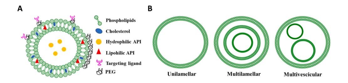 Figure 2. A. Representative liposome structure. A lipid bilayer containing an aqueous core is formed through the self-assembly of cholesterol and phospholipids. Drugs that are hydrophilic are contained in the aqueous core, while drugs that are lipophilic are found in the lipid bilayer. PEGylation of the particle surface is frequently followed by the functionalization of liposomes, i.e., with certain ligands. B. Schematization of liposome subtypes that are most common.