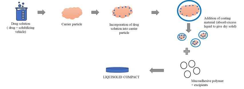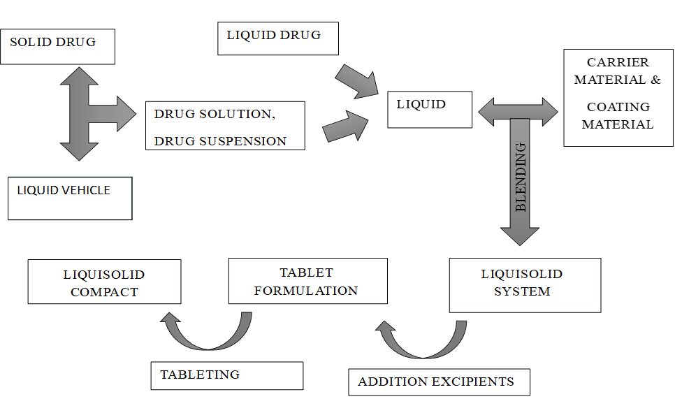 A fixed quantity of carrier material—optimally porous with adequate absorption capacity—is blended with an accurately measured volume of the prepared drug solution, suspension, or liquid formulation. This wetted mixture is subsequently combined with a precisely determined amount of coating material and mixed to yield a dry, non-adherent, free-flowing, and readily compressible powder. Excipients composed of fine, highly adsorptive particles are particularly effective in this process. Finally, liquisolid compacts are produced by incorporating various adjuvants, such as lubricants and super disintegrants, into the final liquisolid formulation prior to compression or encapsulation.(24)