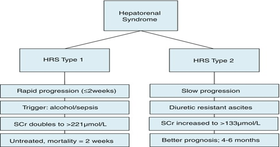 A doubling of serum creatinine to more than 221 μmol/L (2.5 mg/dL) or a halving of creatinine clearance to less than 20 mL/min in less than two weeks are signs of type 1 HRS, which is characterized by rapidly progressing kidney failure. People with type 1 HRS have an especially poor prognosis; after one month, the mortality rate is more than 50%. [6] Individuals with type 1 HRS are typically sick, may have low blood pressure, and may need medication to maintain blood pressure (vasopressors) or to strengthen the contraction of the heart muscle (inotropes). [7] In contrast to type II, kidney failure in type I hepatorenal syndrome stabilizes and gets better with treatment.The cornerstones of treatment are volume expanders and vasoconstrictors.[8] Due to new research, the International Club of Ascites revised their definition of HRS Type 1 in 2015. Known as HRS-AKI, it can be identified even if the serum creatinine level is less than 2.5 mg/dl (221 umol/L) because there is no minimum creatinine value required.[9]