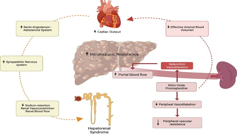 The neurohormonal cascade that causes HRS can be set off by cirrhosis and portal hypertension. Vasodilators and cytokines such as prostaglandins and nitric oxide are then produced and released, leading to both systemic and splanchnic vasodilation. Three distinct compensatory mechanisms are activated by the carotid and aortic arch baroreceptors in response to a systemic decrease in circulating pressure. These include the release of vasopressin, the sympathetic nervous system (SNS) being activated, and the renin-angiotensin-aldosterone system. Further renal vasoconstriction is induced by the decline in cardiac output and systemic vascular resistance brought on by the progression of cirrhosis. [3] Renal vasoconstriction exacerbates the subsequent renal hypoperfusion, which ultimately results in renal failure. Gastrointestinal bleeding, large volume paracentesis of ascites without plasma expansion, and spontaneous bacterial peritonitis are the most frequent causes of HRS.[15]