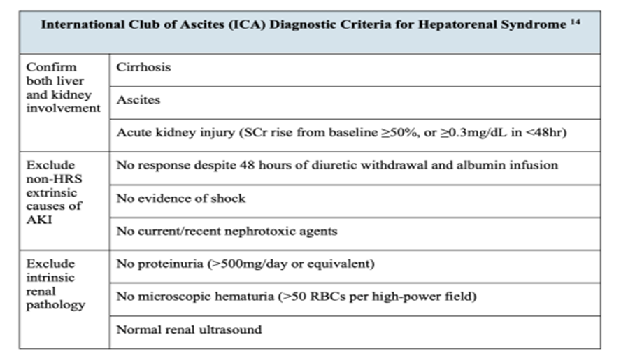 Both liver function and end-organ dysfunction should be assessed in any patient exhibiting signs and symptoms of progressive liver failure. In addition to the hepatic panel of bilirubin, protein, albumin, and transaminases, laboratory tests should include a complete blood count, metabolic panel, blood gas, lactate, ammonia, and coagulation studies.[16] Urinalysis, urine osmolality, and the computation of fractional sodium excretion (FENa) and fractional urea excretion (FEUrea) should all be part of the urine evaluation process.[18] How can these labs be useful? Recognizing acute kidney injury (AKI) is the first step in diagnosing HRS in a patient with liver failure. Serum creatinine (sCr) fluctuates with severe hepatic dysfunction in addition to age, sex, and body mass index. Such dysfunction reduces muscle mass for creatine supply in the first place and hinders the conversion of creatine to creatinine.[17] According to the International Club of Ascites guidelines, if the sCr increases by 50% from baseline or by 0.3 mg/dL from the initial sCr within 48 hours of admission, AKI is diagnosed in these patients.[19] Since HRS is a diagnosis of exclusion, the AKI still needs to be further differentiated from there.[17] According to a prospective study of 562 cirrhotic patients, spontaneous bacterial peritonitis (SBP, 46%) was the most common cause of renal failure in this population, followed by hypovolemia (32%), and HRS (13%). This means that HRS is by no means the most common cause of kidney injury in cirrhotic patients.[20] Therefore, before a patient with cirrhosis, ascites, and AKI is definitively diagnosed with HRS, other causes of kidney injury must be ruled out through diagnostic and possibly therapeutic interventions. These include treating hypovolemia and any underlying infections, as well as discontinuing any nephrotoxic, vasodilatory, and diuretic medications.[18]