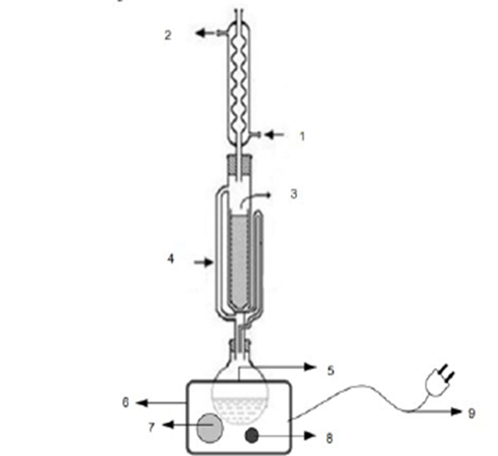 The extraction process uses a Soxhlet apparatus (Figure 1). For each experimental unit, 50 g of mango kernel flour was used, wrapped in cotton and filter paper, and then placed in a Soxhlet sleeve. This sleeve was inserted into the Soxhlet thimble facing upwards. The solvent was put into the thimble until it was full and flowed into a 3-neck flask of 1000 mL that was under the thimble. The solvent continued to be added until it covered the Soxhlet sleeve. The reflux condenser, which has been connected to a water pump, was then connected to the Soxhlet thimble. The flask was heated using a heating mantle at 80? and adjusted using a thermometer setting. The extraction process continues until the solvent in the thimble becomes clear. The sleeve was removed from the thimble, and the mango seed kernel and solvent were separated by heating the flask until the solvent evaporated and separated from the thimble. The mango seed kernel product in the flask was transferred to a dark packaging container and stored in the freezer.[5]