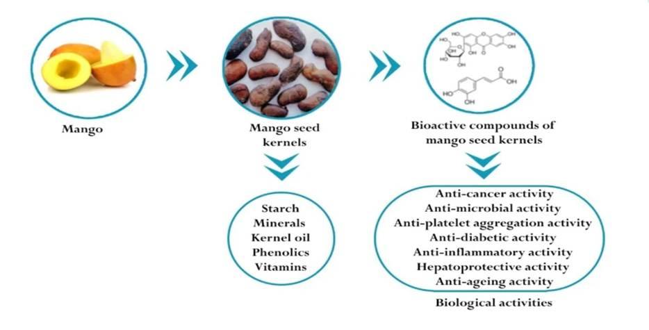 The mango (Mangifera indica L.) is one of the most important tropical fruits in the world, thanks to its pleasant taste and aroma and high nutritional value. It is rich in water, sugars, fibre, minerals, vitamins, and antioxidants [2]. Based on its chemical composition, it is regarded as the king of fruits[2]. During the consumption and processing of mango, a large quantity of by-products in the form of peel and seeds are generated and generally discarded as waste. Mango waste generated at domestic and industrial levels requires attention and a proper solution for its disposal and value addition. In the recent past, mango seed kernels and peel have received great attention, considering their nutritional and pharmaceutical importance. Mango seeds and peel contain a significant amount of proteins, fats, carbohydrates, and some specific bioactive compounds. The mango seed kernel contains 53.34 to 76.81% carbohydrates, 5.20 to 10.48% proteins, 9.84 to 18.0% fat/oil, and 0.26 to 10.60% crude fibre[4]. The mango seed has aroused special scientific interest because it has been reported as a bio-waste with high content of bioactive compounds (phenolic compounds, carotenoids, vitamin C, and dietary fibre).