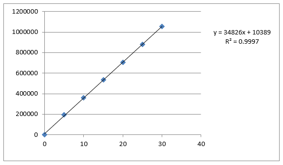 To demonstrate the linearity of assay method, inject 6 standard solutions with concentrations of about 18.75 ppm to 112.5ppm of Lasmiditan. Plot a graph to concentration versus peak area. Slope obtained was 34826Y-Intercept was10389and Correlation Co-efficient was found to be 0.999 and Linearity plot