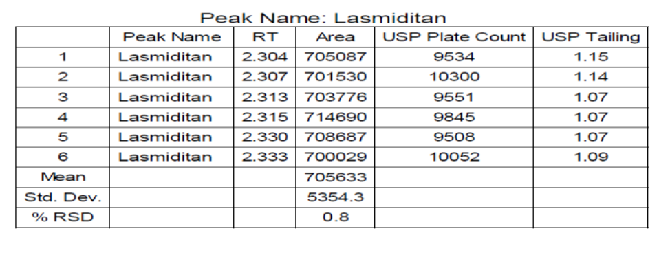 The system suitability parameters were determined by preparing standard solutions of Lasmiditan (20ppm) and the solutions were injected six times and the parameters like peak tailing, resolution and USP plate count were determined.