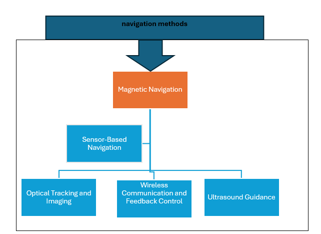 As robotics, sensing, and medical imaging technologies evolve, the navigation methods focus the progress on developing more sophisticated and advanced micro robots for biomedical purposes. (47-48) For micro robots' navigation inside the human body, one can use magnetically controlled, wirelessly communicable, optically tracked, and sensor integrated robots. These methods cultivate precise movement, flexible adaptation, and improved safety during medical procedures. Here are the most common navigation methods for micro robots inside the human body: -