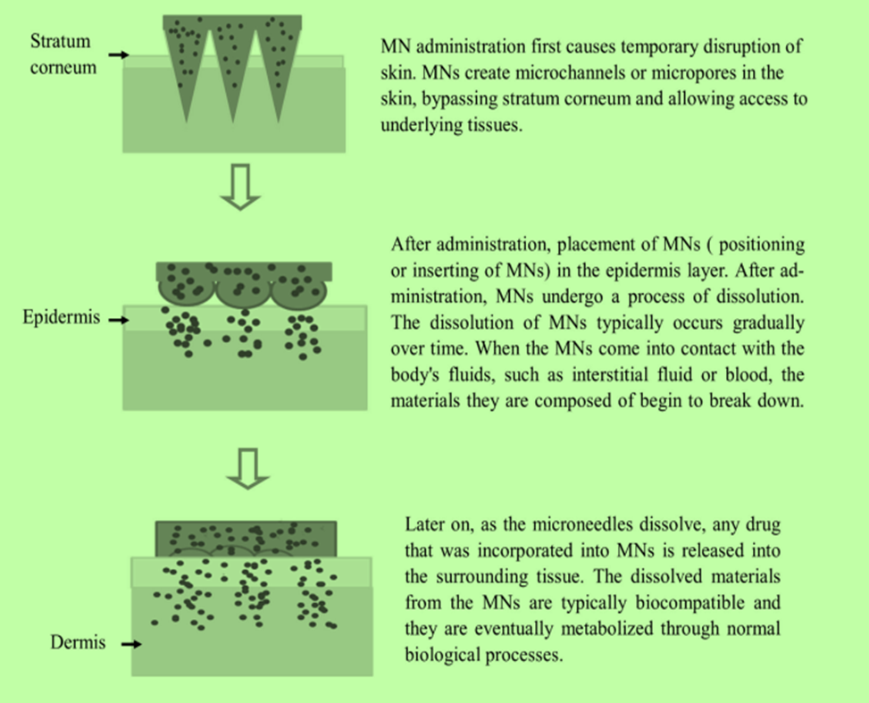 Transdermal patch needs the medication to pass through the stratum corneum barrier, its bioavailability is reduced. By adding the transdermal patch can act as a permeability enhancer by somewhat increase drug penetration. The dermis is deeply penetrated by the hypodermic needle, which contains pain receptors. Because it hurts, patients are less likely to comply, even though it can deliver 90–100% of the loaded medicine. MNs release 100% of the loaded medicine painlessly by avoiding the stratum corneum barrier and entering the dermal and epidermal layers directly.