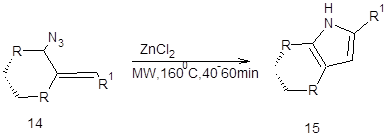Deb et.al produced ring-fused pyrrole in a single step by reacting 1,3-diketone 11 with cyclic aniline 12 at 280 degrees Celsius when exposed to microwave radiation. Within ten minutes, the process, which was catalysed by 0.5 equivalent of p-toluenesulfonic acid (p-TSA), produced a 53% yield. Using 20 mol% ZnCl2 (1.0M in ether) to assist the ligand-free 5-endo-dig cyclisation of homopropargyl azide 14 in CH2Cl2 at 105 C, pyrroles (eight examples) were formed in 40–60 minutes with yields ranging from 91% to 41%. In contrast, the same result was obtained after 16 hours of traditional heating at 160 °C.