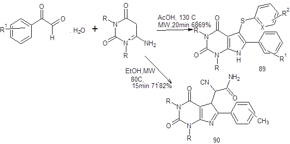disclosed a three-component reaction of substituted aryl glyoxal monohydrate , 6-amino-1,3-disubstituted uracil and substituted thiols under microwave conditions using acetic acid as a solvent to successfully furnish 5,6-disubstituted pyrrole [2,3-d] pyrimidine-2,4-diones . Similarly, excellent yields were obtained when the thiol was replaced by malononitrile [11] even in the absence of catalyst or any promoter. The malononitrile undergoes hydrolysis forming an amide, thus giving rise to a series of pyrrole[2,3-d] pyrimidine-2,4-diones acetamides under microwave irradiation. An interesting observation by the authors surfaced that the conventional approach to the malononitrile protocol delivered comparable yields in longer reaction time (5–8 h). A gram-scale attempt under microwave conditions delivered the desired product in better yields than the reflux strategy.