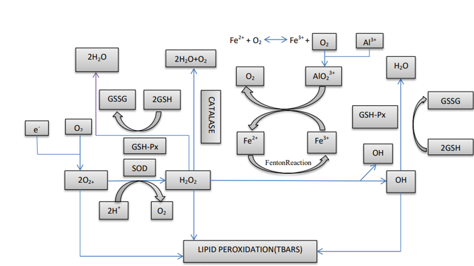 Iron intervened lipid peroxidation is expedited by aluminium chloride which give rise and results notable disturbance in the reactive oxygen species production by elevating the iron concentration which is of redox active in the brain. Further elevation and rise of oxy-radicals & cellular homeostasis mislaying develop notable disturbance in the reactive oxygen species which is oxidative damage that give raise to cerebral deterioration (Amjad et al., 2015). Enzymes like haemoxygenase-1, superoxide dismutase etc. and malondialdehyde, carbonyls, nitrotyrosines, peroxynitriles, are the oxidative products liberated and released in the neurons (Markewberry et al., 1994). In glia, astrocytes and microglia, aluminium chloride status and its correlation to oxidative damage remain well detailed. Oxidative reactive oxygen species-antioxidant imbalance mainly characterized and categorised by elevated lipid peroxidation and a reduced level of antioxidant enzymes (Yokel et al., 1998) Against superoxide, super oxide dismutase function as a primary or frontline defence where the superoxide anion is transformed or converted and give rise to hydrogen peroxide and Oxygen, is a condition primarily under oxidative stress. It can furthermore detoxicate superoxide radicals to hydrogen peroxide, which is further converted to H2O by Catalase at the expense of reduced glutathione (GSH). In the reduced form glutathione is the great bountiful antioxidants intracellularly and is intricate and correlation in the uninterrupted forage of free radicals (Naidu et al., 2013). Aluminium adapts the state of cellular redox by which enzymes are inhibited, correlated and intricate in defence of antioxidants which further results as inhibitors of free radicals process. In the regions of cerebrum, cerebral hemisphere and in the site of brain stem following aluminium subjection will be a notable and remarkable reduction in the activities of sodium oxide dismutase (Nehru et al., 2005). To the brain phospholipids which is negatively charged, aluminium get binds which contains polyunsaturated fatty acid and are striked simply by Oxygen (O2), Hydrogen peroxide (H2O2), and Hydroxide (OH) which are reactive oxygen species (ROS) (Verstraeten et al., 1997). In the fenton reaction aluminium energise and trigger iron initiated lipid peroxidation, which causes building of ROS and emergence of Fe3+. Al-O2 complex is formed by Al3+ in which superoxide is neutralized and further increases and elevate the O2 oxidative capacity (Exley et al., 2004). Schematic representation shows relationship among the enzymes of anti-oxidants, Al, ROS, and lipid peroxidation which is shown in Fig.1 (Customize from the exley research findings (Exley et al., 2004) (Halliwell and Gutteridge et al.,2007).