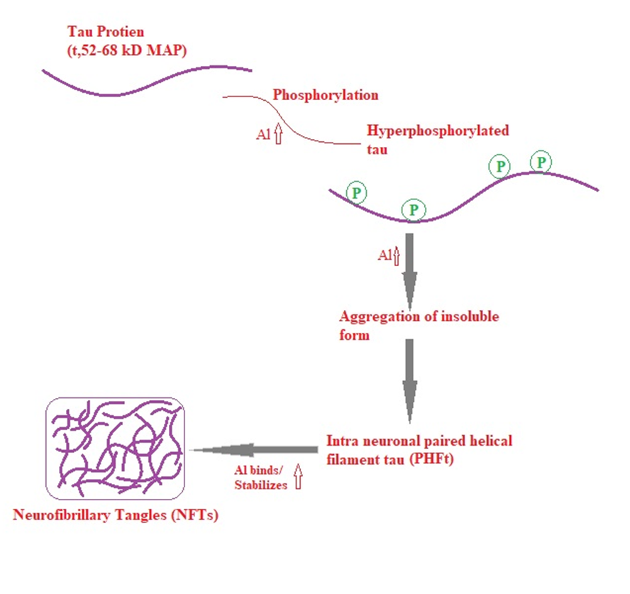 (Kihira et al., 1993). In healthy neurons microtubules bounds tau proteins and is very much required and is vital to neuronal cytoskeleton formation and function. Al-ATP, glutamate receptor stimulated by glutamate and give raise to a maximized level of neuronal tau (Esclaire at al., 1997). The potentiality to individual self-gathering into structures of filamentous are the important feature of tau proteins that are the pathological signs of taupathies (Haase-Kohn et al., 2004). Research studies show that the tau aggregates which is induced by the aluminium are not in the form of fibrillary but seems like amorphous form. Fibroblast toxicity could be produced by the induction of aluminium that expressed tau. Moreover, in these cell tau did not accumulate, but undergoes accumulation of neurofilaments in aluminium treated cells (Leterrier et al., 1992). Induction of aluminium in soluble form causes neurofilament monomers and tau. Further undergo results in the formation of accumulation in to non-fibrillar materials. Eventually Induction of aluminium to form neurofibrillary tangles and fibrillary bundles of neurofilaments (Leterrier et al., 1992; Troncoso et al., 1990). Ultimately aluminium induces and gives rise to tau hyperphosphorylation in which protein phosphatase-2A (PP2A) is inhibited actively in pyramidal cell. Further, caspases is operated by aluminium which shortens tau protein which is hyperphosphorylated, and amass it into granules. When joining the pile of gatherings appears as cytoplasmic pools. Elevated agglomeration of aluminium/shorten tau which is hyperphosphorylated may give raise to trigger polymerization. Polymerization of neurofibrillary tangles filaments within the aluminium/shorten tau which is hyperphosphorylated composite of the cytoplasmic pools (Walton et al., 2010). Formation of NFT by the effects of aluminium is outlined in Fig. 4